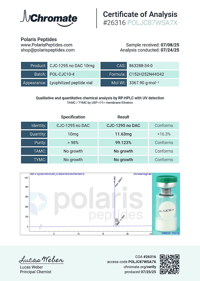 Lyophilized 10 mg vial, >99 % purity (HPLC‑MS) and vacuum‑sealed. Store −20 °C dry; 2–8 °C reconstituted; complete work within 28 days. For laboratory research only. Not intended for human or veterinary applications.