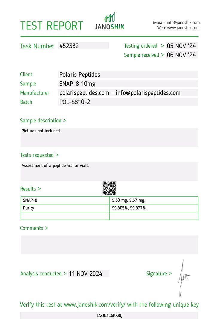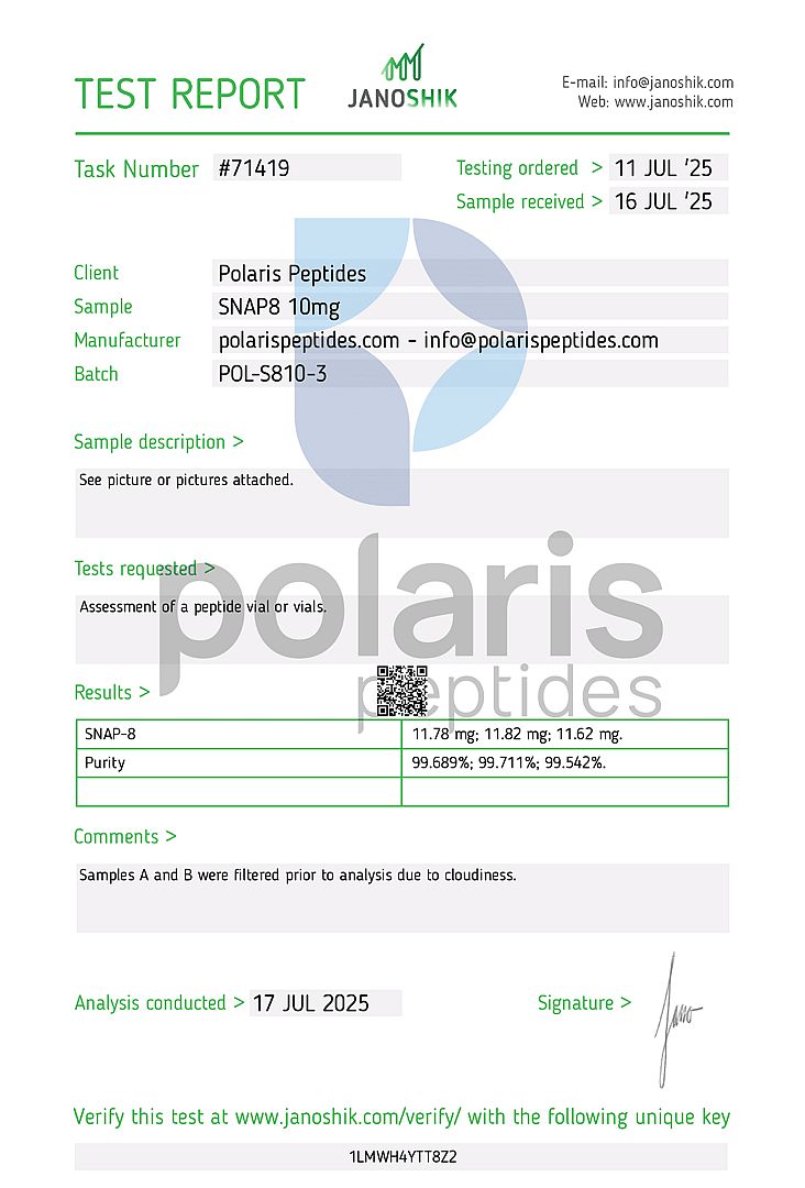 Snap 8 peptide, Lyophilized 10 mg vial, >99 % purity (HPLC‑MS) and vacuum‑sealed. Store −20 °C dry; 2–8 °C reconstituted; complete work within 28 days. For laboratory research only. Not intended for human or veterinary applications.